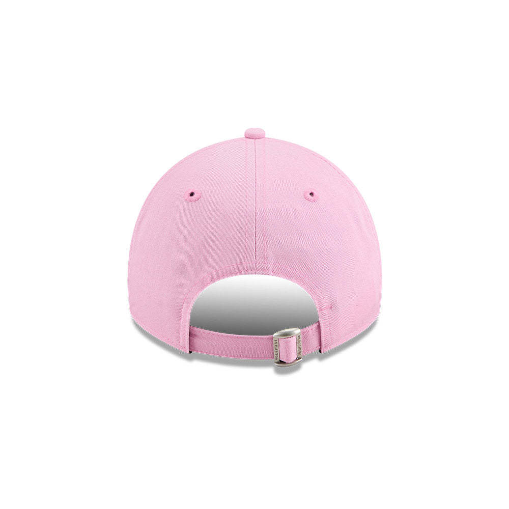 The Australian Open '26 Seasonal Fondant Pink 9TWENTY Cloth Strap features a contrast flat embroidered AO logo on a low-profile unstructured cotton crown, a contrast NE Flag logo on the left, and at the back an adjustable cloth strap enclosure.