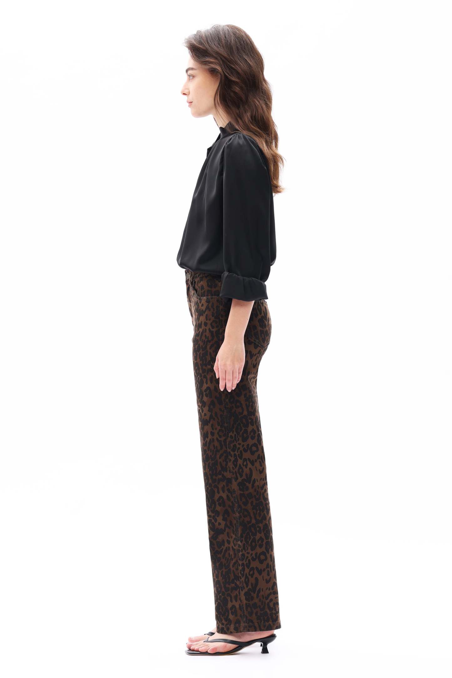 High-rise straight jeans with bold leopard print and rich coffee hues, crafted with comfort stretch for a sleek profile—perfect for the maximalist and animal print trend.