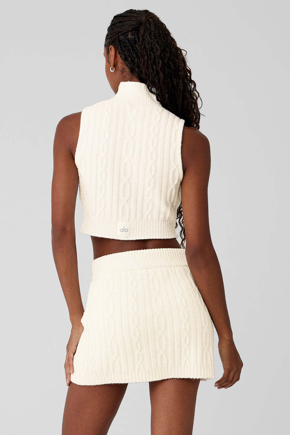 Cable-knit from a plush, dreamily soft fabric blend, this top makes any outfit feel festive and cozy. It has a close fit, a ribbed hem that hits at the waist and a sleeveless silhouette with a ribbed mock neck. Luxe and oh-so-easy to wear, try styling it with the matching Mini Skirt (for a cute party look) or the matching Pants (to cuddle up by the fire).
