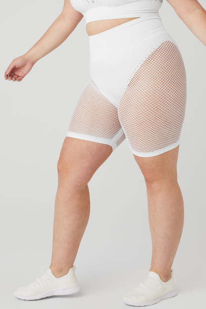 These mesh shorts! Our Seamless High-Waist Limitless Open Air Short is a total breath of fresh air. Seamless, sheer mesh stretches into a biker when they*re on, to stun in practice or on the street. Pair with the Seamless Open Air bra for a bold, head-to-toe look.