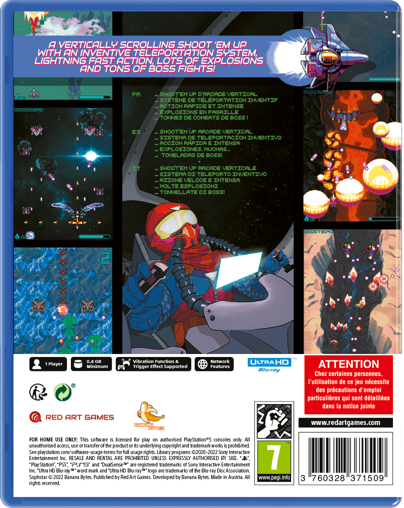 - 9 ships to choose from, each one with different main weapon, subweapon and teleport. Pick the one that suits you style better or just go the extra mile and master all of them!